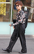 オープンカラーの柄シャツと黒のワイドパンツという組み合せにガ...