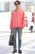 スタンダードなシャツの襟を開けて開襟シャツ風に着こなしたスタ...