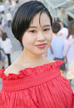 このオフショルダートップスは色と形が気に入りました。胸元のギャザーがかわいいと思って。いまはまだ6月なのでオフショルダーにしましたが、毎年夏はお腹見せスタイルもします。キャミソールを1枚で着たり、ホルターネックも着ますがブラトップはナシですね。今日はこれから飲み会があるので、大人っぽく新宿っぽくしたかったんです。ヘルシーで女性らしいイメージに憧れています。