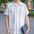 暑かったので明るめの服を選びました。白+インナーでバッグと靴を黒にしてアクセントにしました。インして着たり、中に白や黒の無地Tシャツを着て、ボタンを開けて着ることもありますが、今日は白でまとめたかったっんです。でも白のベルトを持っていなかったので、袖を出して着ています。サンダルはとにかく暑くて。最近は職場にもサンダルで行くくらいです。楽だし涼しくていいんですよね。