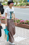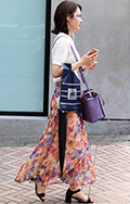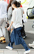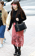 コムデギャルソンのフラワーバッグを持った女性。同じく幅広プリ...