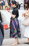 スカーフ柄のような鮮やかなプリントが施されたスカートが新鮮だ...
