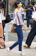 オフショルダートップスの人気は7月から継続。肩口にゴムが入っ...