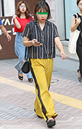 柄シャツ+黒スラックスも定番のコーディネート。黄色系のトップ...
