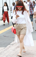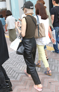 盛夏にも関わらず、レザー(またはフェイクレザー?)素材のパン...