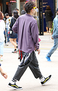 トラッドな印象のチェック柄だが、スリット入りのワイドパンツな...