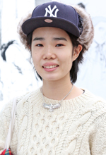 このパンツはコーデュロイ素材が好きで買いました。最近寒いと思っていたので、防寒もかねていて可愛い感じ。古着っぽさを出したくて選びました。コーデュロイはボーイッシュなイメージ。上はニットと合わせて、全体的にダボッとさせています。キャップは元々お父さんがロック系、グランジとかが好きで、カートコバーンがこういうキャップをかぶっていて、ファッションを真似たいと思って買ったものです。