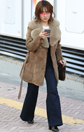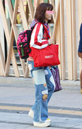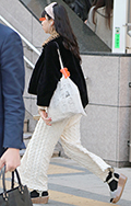 ちょっぴり裾が広がった太パンツも登場している。+厚底サンダル...
