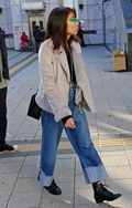 パステルカラーのアウターにブーツカットジーンズを合わせたこち...