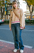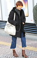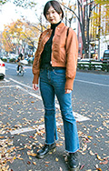 ヒザの切り返しが特徴のセミフレアパンツの彼女。学芸大学にある...