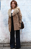 ベージュ系のカラートレンドを背景に久しぶりにムートンを着る女...