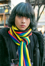 このバッグは親からもらったんです。親がHYSTERIC GLAMOUR好きで、当時ムック本を6冊買ってきて、その1冊をもらいました。肩掛けは両手を空けておきたいから好きではないです。コミカル柄でコーディネートのアクセントにしました。この靴を買った時期ちょうどラバーソールが流行っていて、もともと黒が欲しかったけれど前期物のモデルしかなかったので、チェリーレッドにしました。でも結局、結果オーライでした。ジーンズ+トッド・モデルの合わせ方が好きで、今日はインナーのHYSTERIC GLAMOURのTシャツとのバランスで合わせました。靴は他には8〜10足持っています。ベルベットから黒まであります。