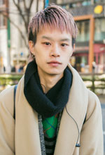 前髪は一昨年くらいから短め+襟足残しのスタイルに。職場の先輩に切ってもらっていて、顔立ちにも合っていると思います。少し前までは後ろを刈り上げるのが定番だったけれど、前髪が軽い分襟足を残してバランスを取る方がいまの気分で時代感に合っていると思います。髪色は昨年からブリーチしてアッシュに。本当はピンクにしたかったです。ヘアサロンは「DADA CuBiC」。整髪料はファイバー系のワックス「ナカノの3番」です。美容師の方のファッションや海外雑誌(『i-D 』など)、海外スナップの影響が大きいです。