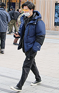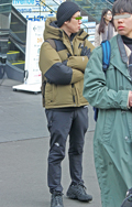 若者はダウンジャケットの前を開けて、肩幅を大きく見せるような...