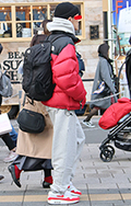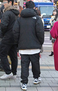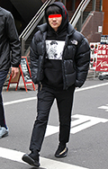 腰履きパンツにノースフェイスのダウンジャケット、ナイキのスニ...