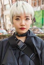 自分が働いているTONI&GUYというお店でブリーチしました。髪型はこだわれるから面白い。今でいうと横をパッツンにしたり、今までは緑だったりウルフヘアーにしていたけど、飽きて切って、色を抜くついでに白まで抜きました。働いているお店のお客様の年齢層が30代~40代と高めで、お客様が主役というコンセプトがあり、お店では黒、白、グレーしか着られないので髪を白くしようと思いました。ボブにしたくて伸ばしています。白い球体を目指しています。