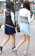 足首までの靴下とスニーカーでヘルシーな脚出しスタイル。左の女...