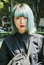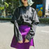 もともと紫色が好きです。黒いアイテムをよく着るので、黒と合わせようと思って紫のスカートを買いました。ポケットのデザインとウエストのベルトデザインが気に入ってます。いつもメンズっぽいアイテムを選んでいて、色とか形とかオーバーサイズのものに下はタイトなものを合わせるスタイルが多いです。基本スタイルよく見えるように意識しています。