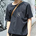 このTシャツは、よく見ると左右で袖の形が違うのが気に入って買いました。今日みたいなオールブラックファッションはよくします。基本的に、黒か白のアイテムしか使ってなくて、色のアイテムはあまり着ないです。白か黒なら、合わせやすいので。白いTシャツはもう持っていたので、2枚目には黒を買いました。黒Tシャツって差別化しにくいと思うんですけど、これは袖が違うデザインで、これならと思って買いました。あと、胸元のロゴがポイントになっていて可愛かったので。