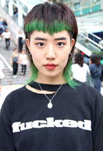 Banny storeに久しぶりに行ったとき、何も買うつもりがなかったのに、プリントが可愛くて買いました。TシャツのネックはPERVERZE(パーバーズ)というブランドでこういうデザインがあって、友人がカットしていたのを見て自分でカットしました。黒は合わせやすいところが好きです。ちゃんとファッションに興味を持ち始めて、2年前くらいから黒を着るようになりました。普段も黒トップスが多いですが、今は夏で上着を着ないので、黄緑・ピンク・青・柄物も着たりします。