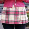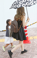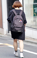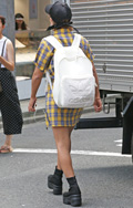 イエローチェックのミニワンピに白いアディダスのリュックが目立...