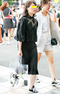 ひざ下丈のタイトスカートが人気だ。手前の女性は昨年の秋冬に人...