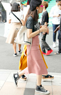 コンサバ感のあるタイトスカートをスニーカーやPVCバッグでカ...