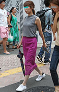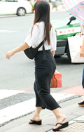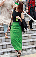 鮮やかなグリーンのロングタイトスカートの女性に遭遇。今季は大...