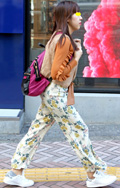 フリルに柄パンツ、ショッキングピンクのリュックと要素の多いコ...