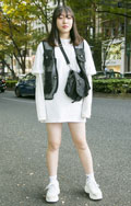シャツの上に重ねたオーバーサイズのベストが今っぽい。高めに下...