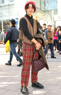 チェック柄のベストの上からベルトでウエストマークすることでコ...