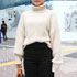 このニットは、首元と裾の絞り具合が絶妙で、こういう色は持っていなかったこともあって買いました。他に、ボートネックでボリュームのある黒や、Vネックでタイトめの赤、カラフルなボーダー柄などのローゲージニットを持っているので、ザックリとした暖かそうな編み地と、全体の色味に惹かれました。首まわりはピタッとしたものより少しゆとりのある、ゆったりとしたシルエットが好みです。今日はハイウエストの黒ボトムで引き締め&脚長効果を期待して、前裾だけトップスインしました。足元はスニーカーが多いです。コンバースやニューバランスとか。どんなアイテムでも、サラッと着こなせる、大人っぽい落ち着いた女性に見られたいです。