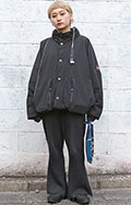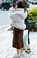 ボリュームのあるダウンを肩から落として女性らしさのあるスタイ...