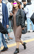 ニットワンピース×ライダースはコンサバ系OLさんに人気のコー...