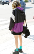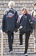 黒×紫のコーチジャケットでペアルックにしたカップル。NBAや...