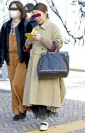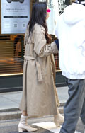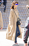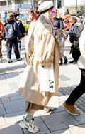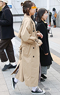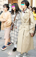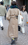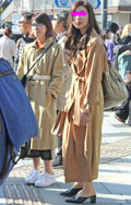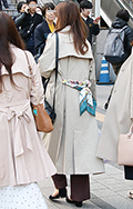 ベージュ系コーディネートの女性達。きちんと前を閉めたトレンチ...