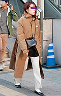 ヘアカラーもバッグもブーティも茶系だった彼女。ウエストを絞っ...