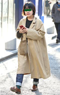 ベージュのコートにベージュのパンツを合わせ、セットアップのよ...