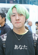 このTシャツは全身の色味を考えて着てきました。派手髪なので基本黒が多いです。なので頭と離れたところに色を持っていきたくて。今日のロンTも髪の色に合わせています。髪の色は1〜2ヶ月ごとに変わります。前は青とかピンクでした。