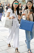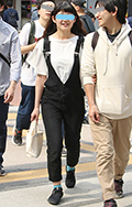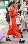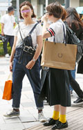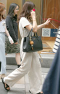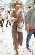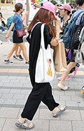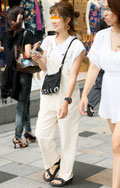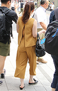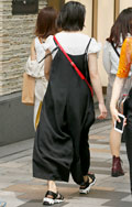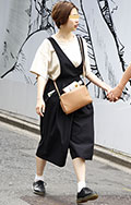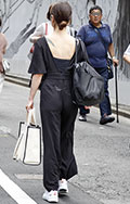 ストラップの片方を外す着こなしも散見されたが、こちらの女性は...