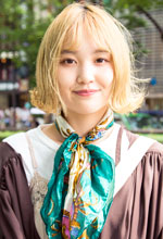 スカートに合わせて緑のスカーフにしました。紫×緑が気分だったので。柄×柄や色物で合わせることが多いです。派手×派手なスカートとか。スカーフは1枚で上級者みたいになれます。30枚くらい持っています。スカートはシルエットを気にします。ベルトを合わせて形はIラインよりAラインが好きです。Tシャツはバンドのライブがあるので着てきました。バンT×ビスチェは日焼け防止に。