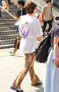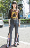 ヘビ柄のフレア—パンツに、ヘビがモチーフのフォトプリントTシ...