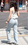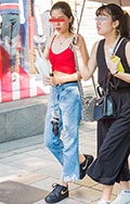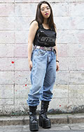 90年代のコギャルのような大胆な肌見せトップス。デニムやスニ...