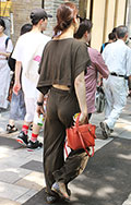 ショート丈のカシュクールブラウスからお腹をチラ見せ。ハイウエ...