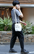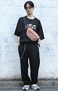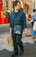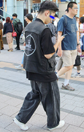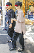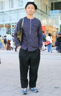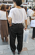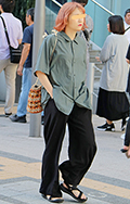 こちらの男性のような裾絞りのワイドパンツも散見された。シャツ...