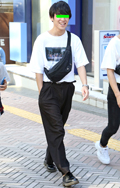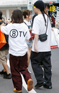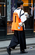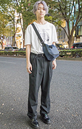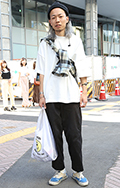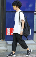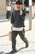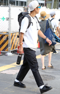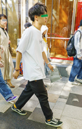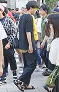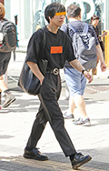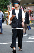 白T+黒スラックスの組み合せも多かった。原宿では差し色のオレ...