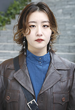ヒールがあるのにした理由は、身長を高く見せたいし、ヒールをはくと自信が持てるんです。ヒールばかりはくのでスニーカーだとすねが痛くなっちゃう。ピンヒールよりは、太めヒールをはいてます。今日のコーデは、レザージャケットと青のブラウスの組み合わせを意識しました。