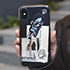 iPhone XS。ケースはセリアのもので、中に入っているのはステッカーの台紙、雑誌の切り抜き、友だちの写真、友達が描いた自分の似顔絵です。