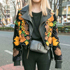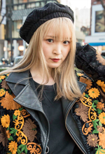 今日の気候だと、ライダースだけでは寒いかなって思って、ジャケットを重ねました。この刺繍のジャケットみたいな襟なしのジャケットは似合わないと思っているので、ライダースの襟を出した組み合わせで着ています。こんな感じの組み合わせは襟なしのジャケットのときに結構やります。今日はカジュアルで楽なスウェットをいちばん最初に着たいと思って、そこからコーディネートを決めました。でも原宿だから、おしゃれに見えつつ気張らない、街にまぎれる格好を、と思ってこれを着ました。疲れやすいタイプで、人が多い場所に行って、派手な格好をすると人に見られて体力を使うので、ブラックを多めにしました。