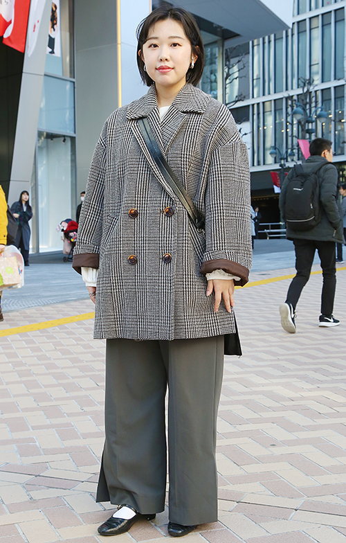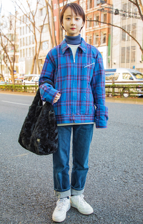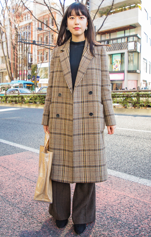 いちばん上に着用したアイテムがチェック柄である女性すべて。色や素材は問わない。